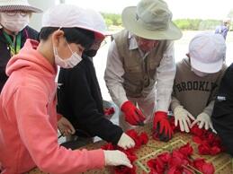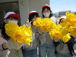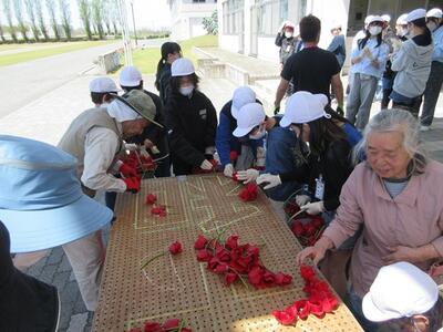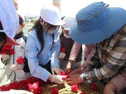 中学生がチューリップの花を摘み、それを6年生が看板に差し込んでいき、花看板の完成です。