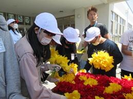 胎内市交通安全協会からご支援いただきながら、築地中学校と合同で花看板づくりをしました。
