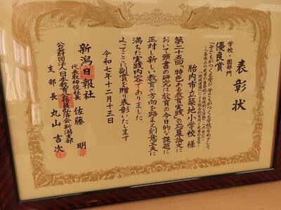 この度、日本教育公務員弘済会新潟県支部から支部長様、専任幹事様、参事様というものすごいメンバーがお出でくださり、「特色ある教育実践(学校・園部門)」に応募した論文優良賞の賞状をお持ちくださいました。