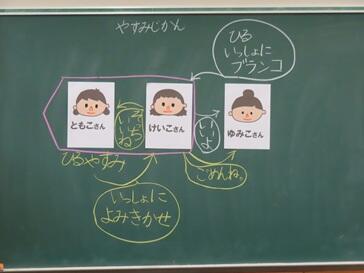 ゆみこが、けいこと昼休みに一緒にブランコをすることを約束します。ところが、ともこが、けいこを「昼休み一緒に読み聞かせに行こう」と誘います。けいこは「いいよ」と承諾してしまいます。(子どもたちは「あー、やっちゃった」と反応。そりゃそうですよね。「もう、けいこったら!」って感じでしょうか。うふふ)
